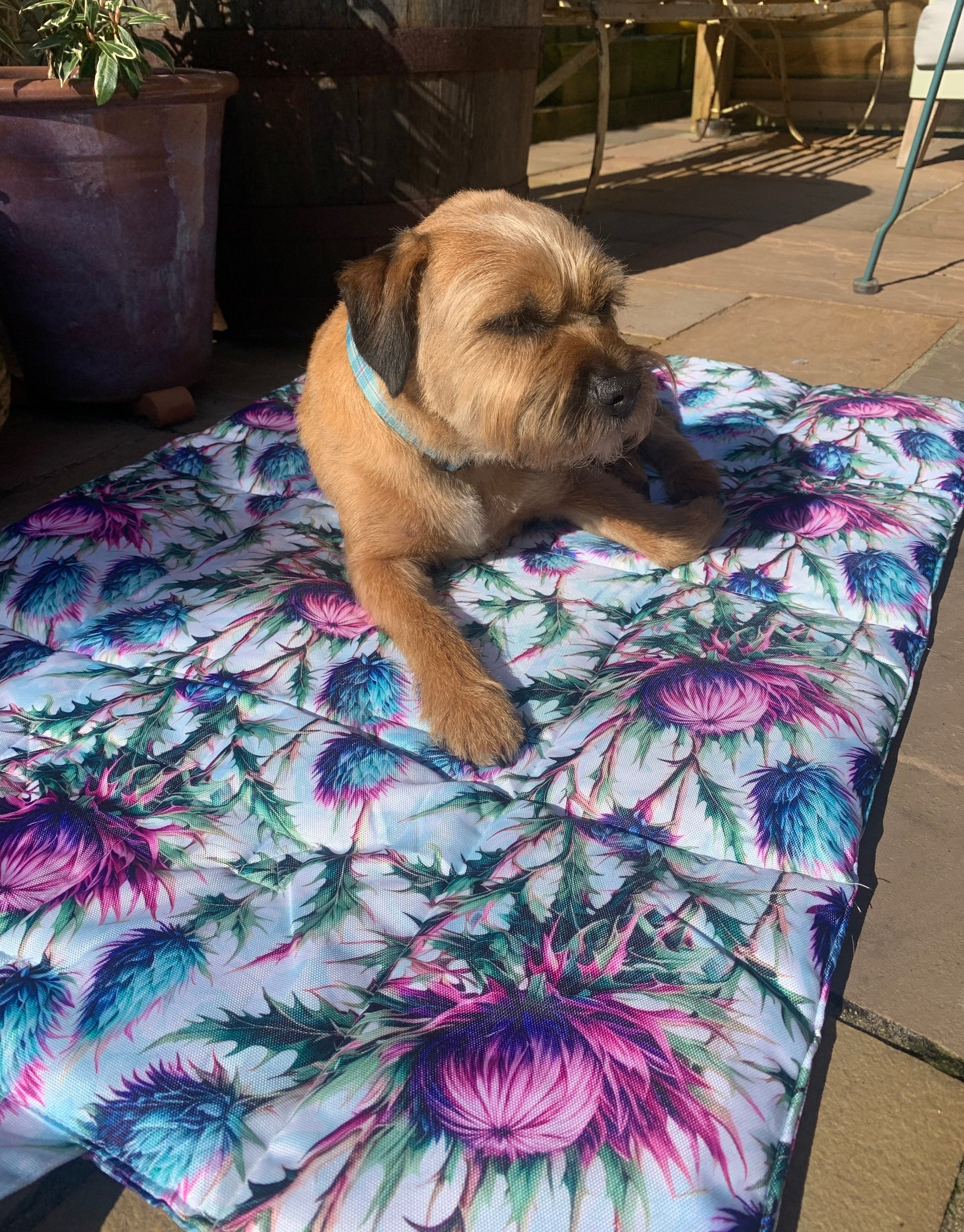 Light-weight, padded pet travel, training and settle mat from our gorgeous limited edition Bonnie collection. Water resistant, easy to carry and clean. Super easy to roll and secured with velcro straps. Integrated carry handle plus additional D-ring to clip-on water bowl or attach to bag.