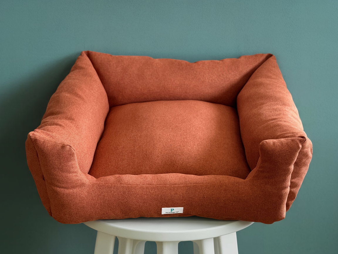 The Prestige Lounger Luxury dog bed in Rust is a handcrafted masterpiece from Yorkshire, designed specifically for mid-to-large dogs. This luxurious dog bed combines premium materials with elegant design and practical features, making it a must-have for pet owners seeking comfort and style. As an orthopedic dog bed, it offers high bolster sides that provide optimal support for your dog's head and neck, ensuring restful lounging.